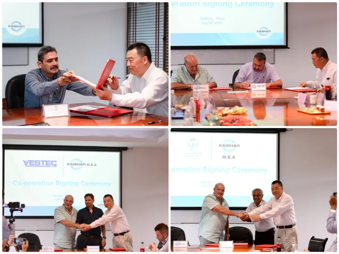 在開山控股集團有限公司董事長曹克堅先生的見證下,Kaishan MEA CEO Mr.John Byrne分別與沙特阿拉伯Kanoo公司、阿聯酋/巴林Kanoo公司、挪威Vestec公司、愛爾蘭LMF-GBI簽署了戰略合作儀式。