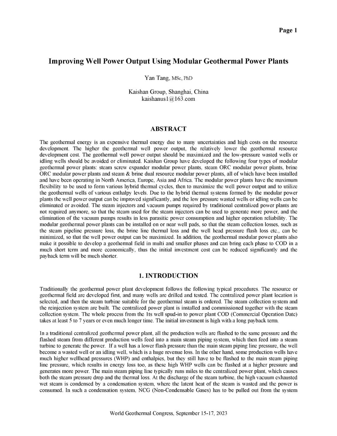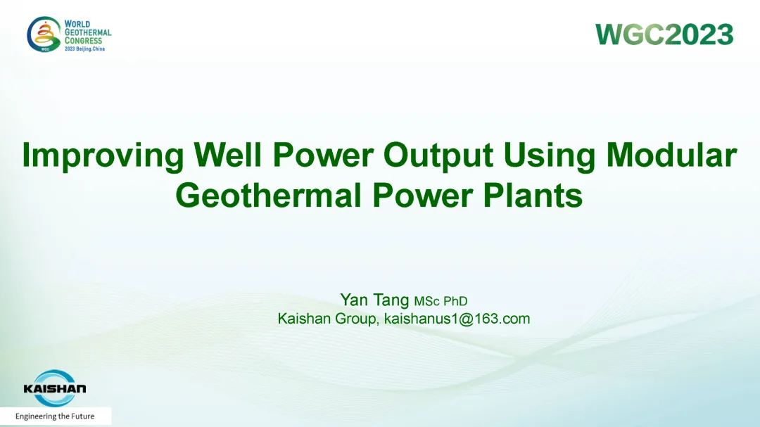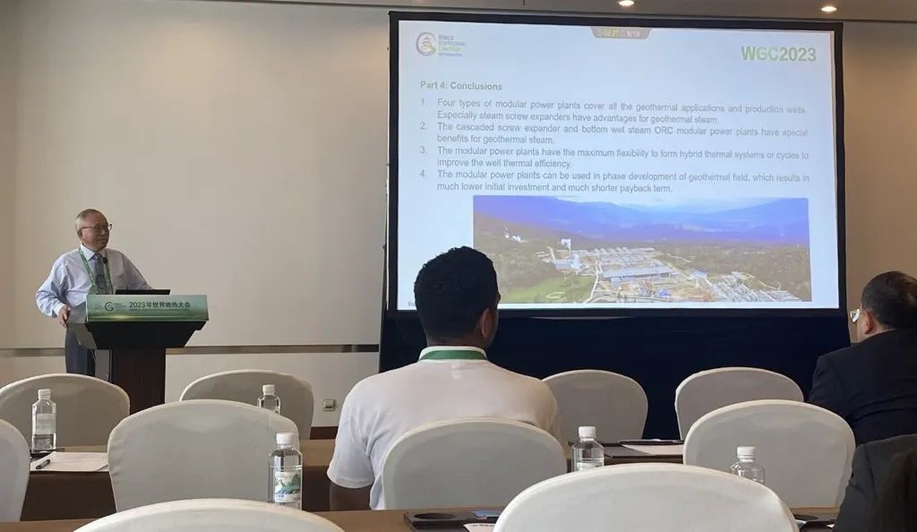 9月16日,公司總經理、開山地熱井口模塊發電技術創始人湯炎博士參加2023年北京世界地熱大會(WGC),並受國際地熱協會(IGA)首席執行官Marit Brommer女士邀請,做了題為《使用地熱模塊電站提高地熱井產量》(Improving Well Power Output Using Modular Geothermal Power Plants)的專題報告。