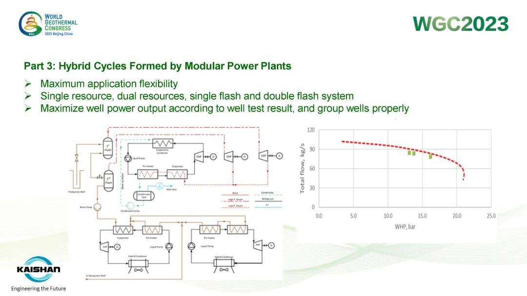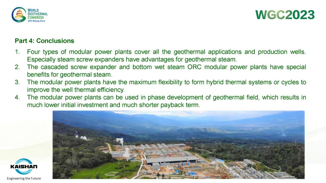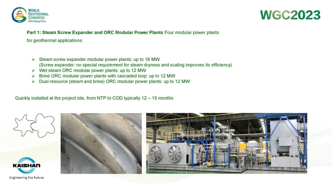 湯炎博士在報告中指出,地熱開發應最大限度提高井的發電量,避免產生低壓井或閑置井。開山成功開發的蒸汽螺杆膨脹機模塊電站、蒸汽ORC模塊電站、鹽水ORC模塊電站和“蒸汽+鹽水”模塊電站可根據不同溫度、壓力的地熱資源提供最靈活、高效的熱力循環係統,最大限度提高地熱井功率輸出。