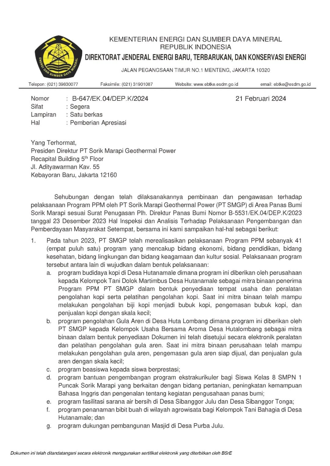 今天上午,開山集團投資在蘇門答臘Mandailing Natal縣的地熱項目公司PT SMGP收到一份來自印尼能礦部可再生和新能源總局(EBTKE)地熱處長Pak Harris簽署的“致PT SMGP的感謝信”,該信函的主旨是對SMGP公司 CDCR 團隊為 Sorik Marapi-Roburan 工作區的社區發展計劃所做的巨大努力表示感謝。SMGP實施的社區發展計劃和援助表明,除了為SMGP運營所在地的社區持續提供地熱開發所產生的電能外,公司還致力於提供其他福利。