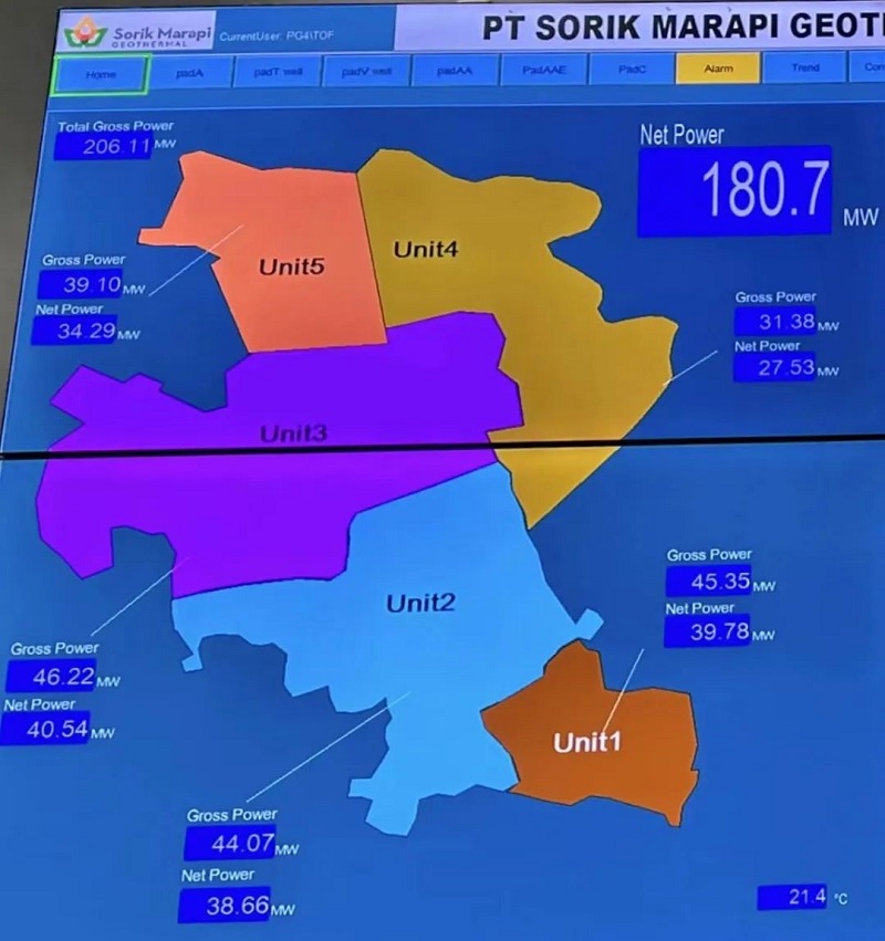 這是重要的裏程碑事件,標誌著SMGP地熱電站進入到"200兆瓦俱樂部”。在全球地熱界,發電功率超過200兆瓦的電站(定義為發電設備生產的電力,外售電量還需要扣除電站運行自耗功)寥寥無幾,SMGP地熱電站這座采用開山擁有完全自主知識產權的模塊電站,勢將成為全球地熱界的“明星”,也是蘇門答臘最主要的地熱電站。
