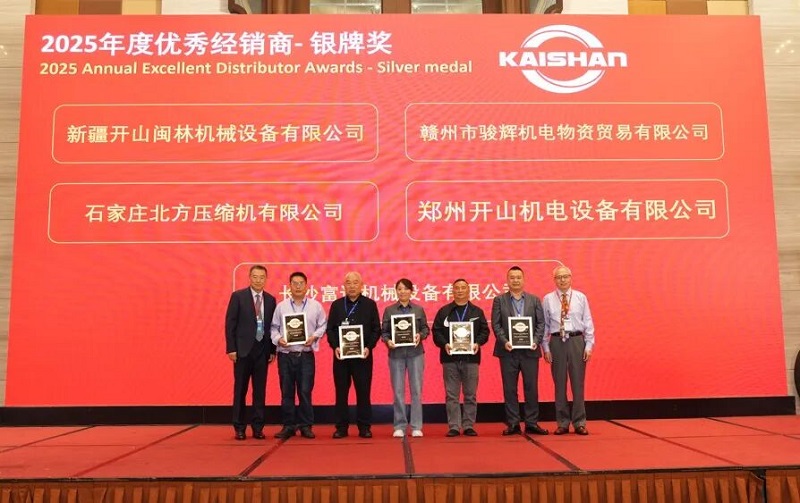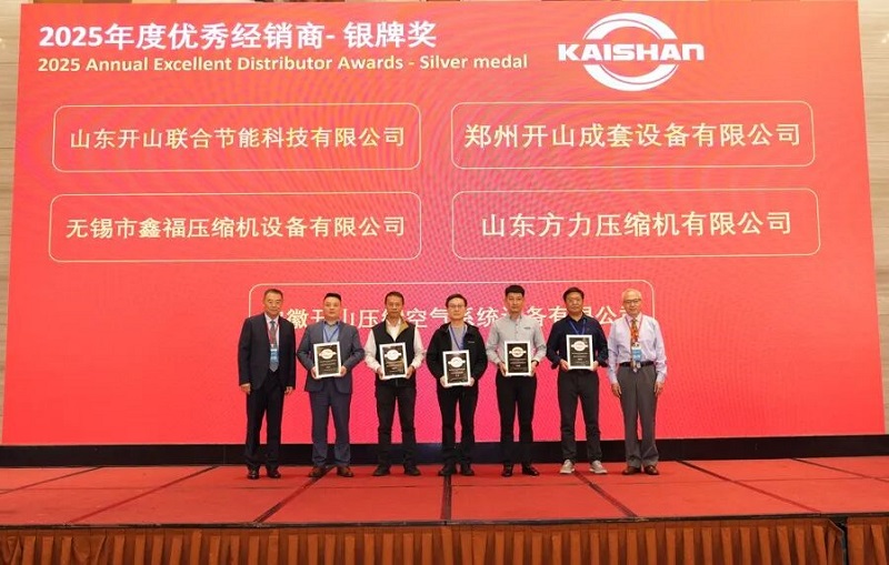 本屆大會按慣例,為34家優秀經銷單位頒發了獎牌。與以往不同的是,其中十家經銷單位因為連續五年獲評“最佳經銷單位”,獲頒特製銀質獎章。宜昌博力開山機電設備有限公司和重慶開山一機節能設備有限公司因為2025年度銷售/dingdantupoyiyuan,shoucihuobanjinzhijiangzhang。qizhongyichangboliyilianxusannianxiaoshouguoyiyuan,zhuyaoxiaoshoukaishanzhonggongdequanyeyazuanchejixiliegaoduanchanpin。zhongqingkaishanyijizexiaoshoubaokuoganshiwuyouluogankongyaji、大功率螺杆空壓機、變節距幹式真空泵、離(li)心(xin)式(shi)壓(ya)縮(suo)機(ji)等(deng)高(gao)端(duan)產(chan)品(pin)。公(gong)司(si)祝(zhu)賀(he)並(bing)感(gan)謝(xie)這(zhe)兩(liang)家(jia)公(gong)司(si)在(zai)幫(bang)助(zhu)開(kai)山(shan)拓(tuo)展(zhan)高(gao)端(duan)市(shi)場(chang)取(qu)得(de)的(de)突(tu)出(chu)成(cheng)就(jiu)。曹(cao)董(dong)號(hao)召(zhao)全(quan)體(ti)經(jing)銷(xiao)單(dan)位(wei)以(yi)他(ta)們(men)為(wei)榜(bang)樣(yang),冀(ji)望(wang)有(you)更(geng)多(duo)的(de)銷(xiao)售(shou)超(chao)億(yi)元(yuan)經(jing)銷(xiao)單(dan)位(wei)湧(yong)現(xian)。